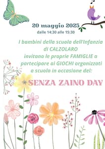 In occasione del Senza Zaino Day, martedì 20 Maggio 2025, i bambini della Scuola dell’Infanzia di Calzolaro, sono lieti di invitare le famiglie a scuola per condividere un’ora di gioco insieme.